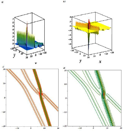 whereThe outcome shown in Figure 7 is the observable feature, which is obtained by combining Eq. (24) and Eq. (5) to illustrate an interaction of a two-M-lump with a soliton solution. A complete list of all constants and functions can be found in this article.