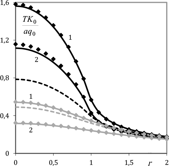 Figure 3 show the distributions of the temperature over the surface of the inhomogeneous half-space z = h (black lines and rhombi) and over the interface between coating and base z = 0 (grey lines and rhombi) for two values of the parameter κ2.