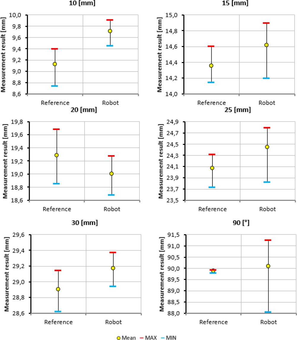 Additionally, Fig. 14 shows the mean values of each geometry with the corresponding error range and resolution – the maximum and minimum values for both the measurement pattern and geometry made by the manipulator.