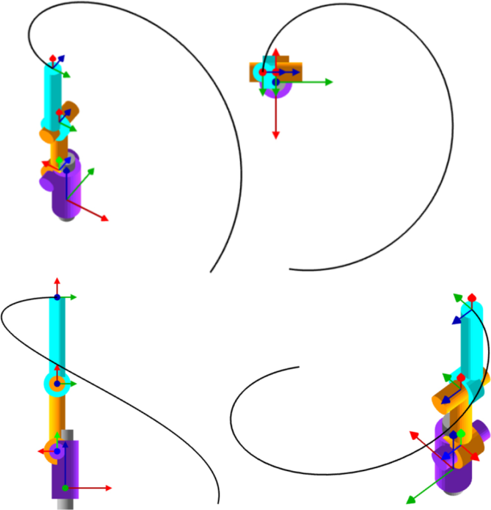 The simulations aimed to obtain information on the marginal positions and trajectories of robot movements to develop an initial strategy for the control algorithm. The resulting information enabled us to focus on specific problematic aspects of robot control. Therefore, by recasting the parameters related to the movement of the joints themselves and the homogeneous transformation matrix (Equation 1), a matrix defining the individual marginal positions of the joints and end-end elements of the manipulator (Fig. 2) was obtained. Analyses, calculations, and simulations were performed using the RoboAnalyzer v. 7.5 software (Mechatronics Lab, India).