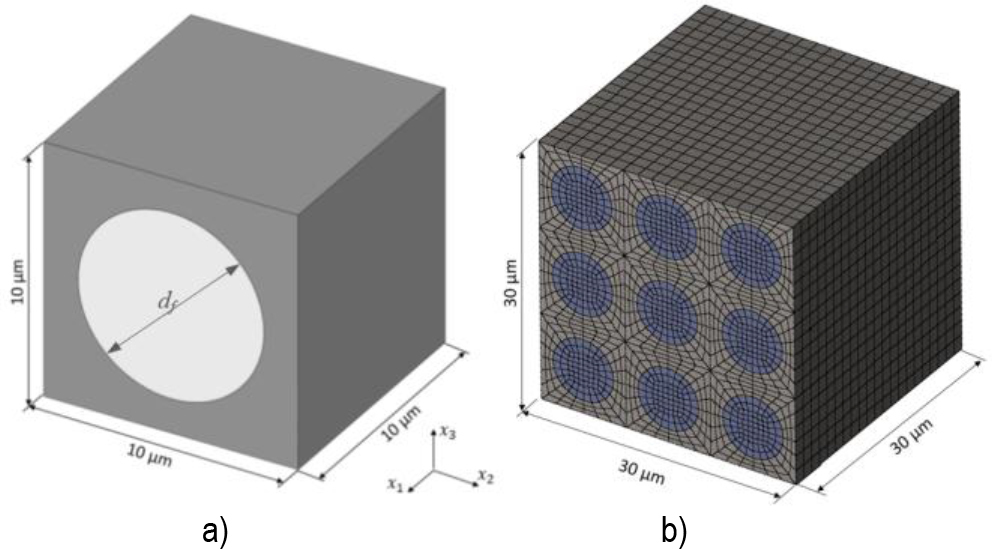 A fibre-reinforced composite with uniform distribution of unidirectional fibres is considered. RVE contains 9 uniformly distributed parallel fibres. The dimensions of the RVE are assumed as 30×30×30 μm (Fig. 2). The volume fraction of the reinforcement f depends on the diameter of the fibre df. The geometry is discretised into 29 484 high-quality hexahedral elements with quadratic shape functions (He×20), resulting in 124 531 nodes and 373 593 DoFs.