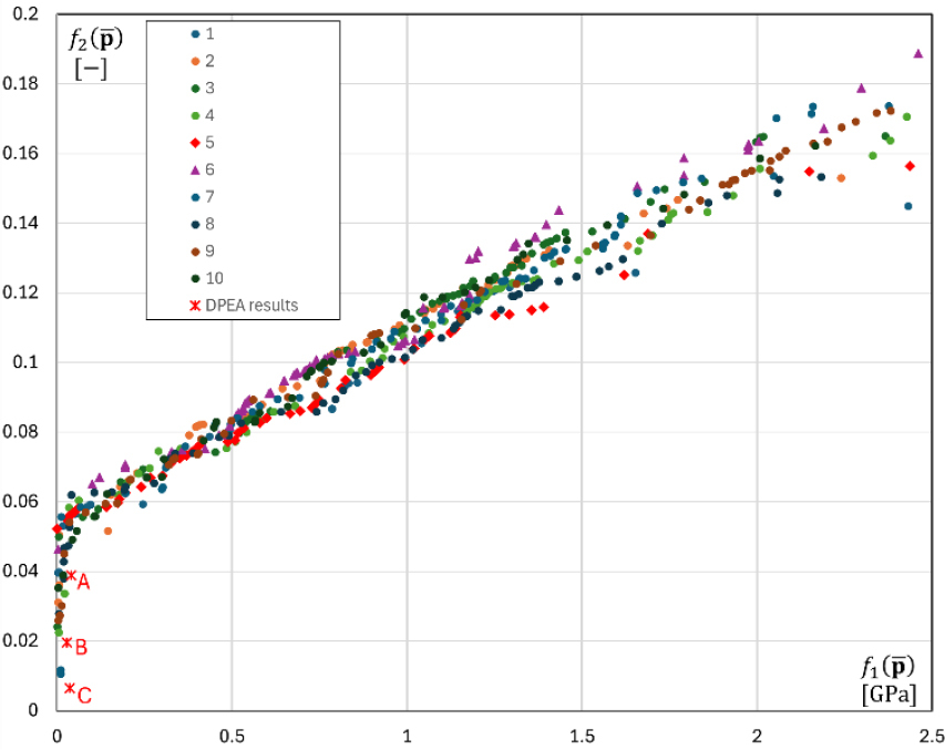 To solve the optimisation problem, the RS, describing material behaviour for a wide range of identified parameters, is created. To create the RS in terms of the 2nd order polynomial, the DoE is performed. The CCF variant of Central Composite Design is used, resulting in 43 design points [41]. The output values are calculated using periodic boundary conditions. Numerical homogenisation is performed for each design point.