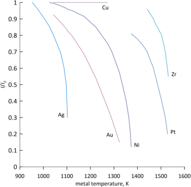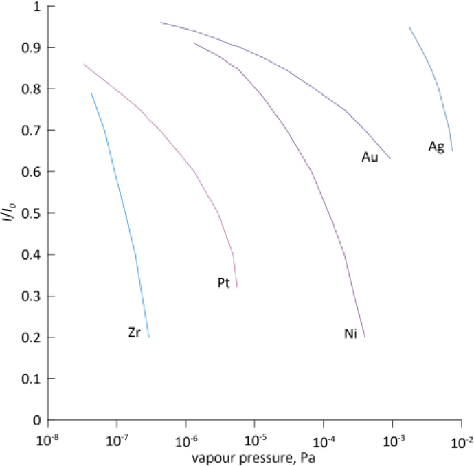 Dispenser cathodes are efficient sources of electrons that are used in experimental research on thermionic energy conversion. The emission layer of this cathode is sensitive to the influence of metal vapors, including Ag, Au, Ni, Fe (Steels), Pt, Zr [10, 11], whose presence causes an increase in the cathode electron work function and a drastic reduction in the electron thermionic current, an effect known as cathode poisoning. The higher the melting point of the metal, the higher the temperature at which the cathode is poisoned by vapors of that metal. The normalized electron thermionic emission current as a function of temperature and vapor pressure for selected metals is shown in Figs. 1 and 2.