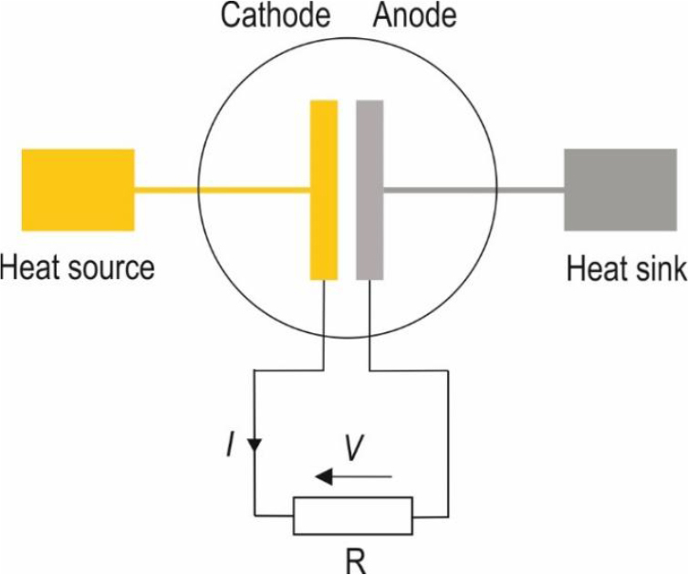 The electrodes are placed in an ultra-high vacuum chamber and are connected to the load R by means of electrical feed-throughs. The cathode is thermally connected to the heat source, and the anode to the heat receiver. Under the influence of thermal energy supplied to the cathode, electrons are emitted from the cathode surface, then reach the anode by ballistic motion and return to the cathode through the load R. The electrode materials should be selected so that the electron work function ϕc of the cathode is greater than the electron work function ϕA of the anode.