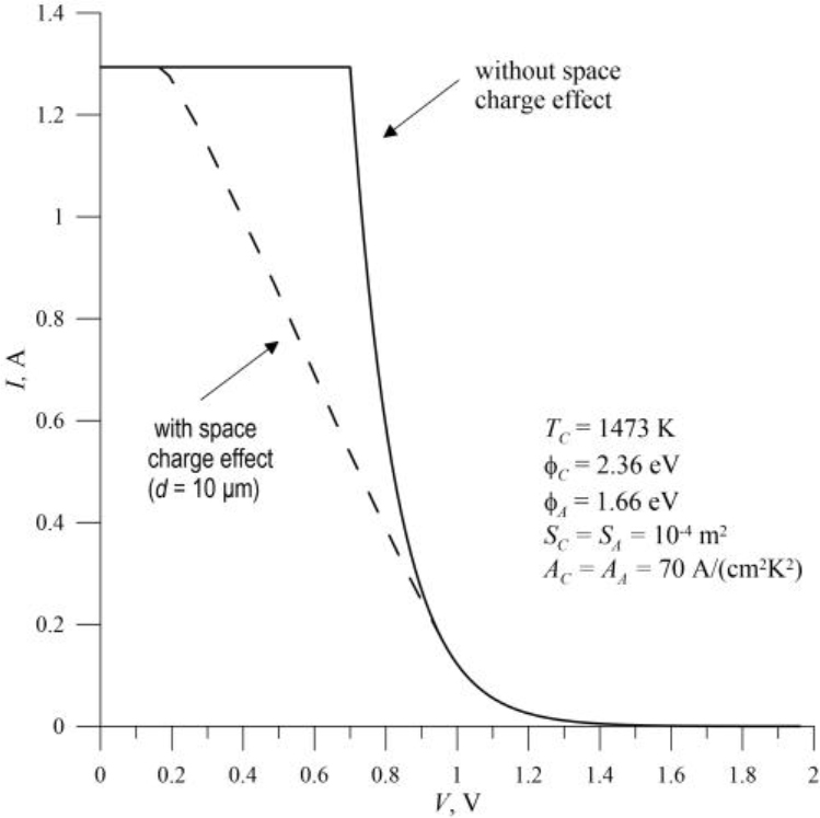 Model of current-voltage characteristics for an ideal converter and a real converter, taking into account the influence of negative space charge in the cathode-anode area. d is the mutual distance between the cathode and the anode