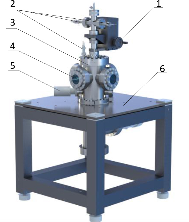 Model of a vacuum thermionic heat-to-electric energy converter test stand. 1 – manipulator, 2 – vacuum electrical feedthroughs, 3 – vacuum chamber, 4 – viewing window, 5 - vacuum gauge, 6 - test stand frame