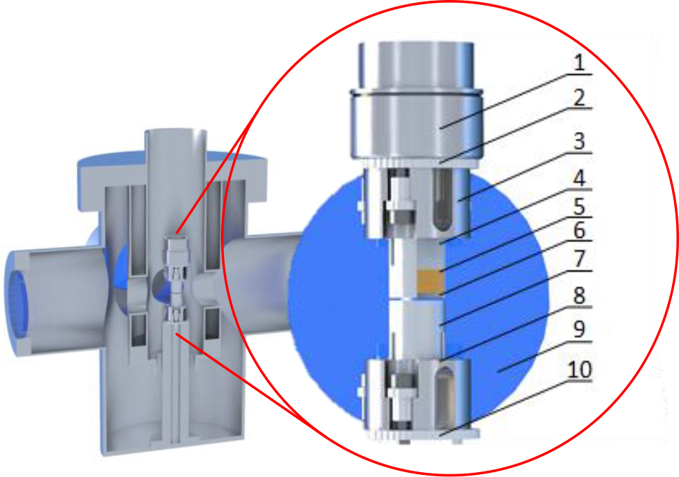 Virtual model of the chamber in a semi-cross-section view, adapted for numerical analysis. 1 – manipulator core, 2 – ceramic cathode pad, 3 – cathode mounting base, 4 – internal cathode insulation (half-cross-section view), 5 – cathode heater, 6 – cathode front surface, 7 – anode, 8 – anode mounting base, 9 – borosilicate glass of the viewfinder, 10 – ceramic anode pad
