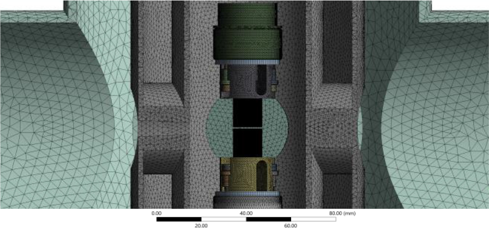 The geometric model of the chamber was developed in a CAD environment and then imported into the Ansys Workbench 2024 platform, where the subsequent stages of preparing the model for thermal analysis were carried out. The cylinder of the test chamber has a diameter of 0.16 m, and the geometric volume of the chamber is 0.01 m3. Due to the characteristics of the finite element method and the need to ensure convergence of calculations in the Space-Claim module, the geometry was simplified. To this end, roundings, chamfers, technological openings, and other details irrelevant to heat conduction were removed. Component assemblies were replaced with homogeneous solids with equivalent thermal properties. Elements made of different materials were defined as separate geometric domains, which made it possible to assign individual thermal conductivity parameters and emissivity coefficients to them. Particular attention was paid to the correct mapping of contact surfaces, eliminating gaps and wall penetration (so-called coincident faces), which could interfere with the analysis of heat conduction and radiation. The geometric model was verified using the Repair Geometry and Detect Gaps tools, removing topological errors and preparing the model for the discratization process. A crosssectional view of the prepared model is shown in Fig. 7. In the upper part of the structure, the following can be distinguished: the manipulator core (1) made of 316L stainless steel, a ceramic cathode pad (2) made of Al2O3, the cathode mounting base with mounting elements (3), the 311 M cathode dispenser in a molybdenum housing (6), inside which an insulating section (4) and a heating section (5) with a tungsten microheater were separated. The microheater is embedded in a structure filling the interior of the electrode with aluminum oxide. The lower part of the drawing shows the 311M electrode forming the anode, the mounting base (8) of the anode and the ceramic spacer (10). Between the cathode (6) and the anode (7) there is a gap with adjustable width.
