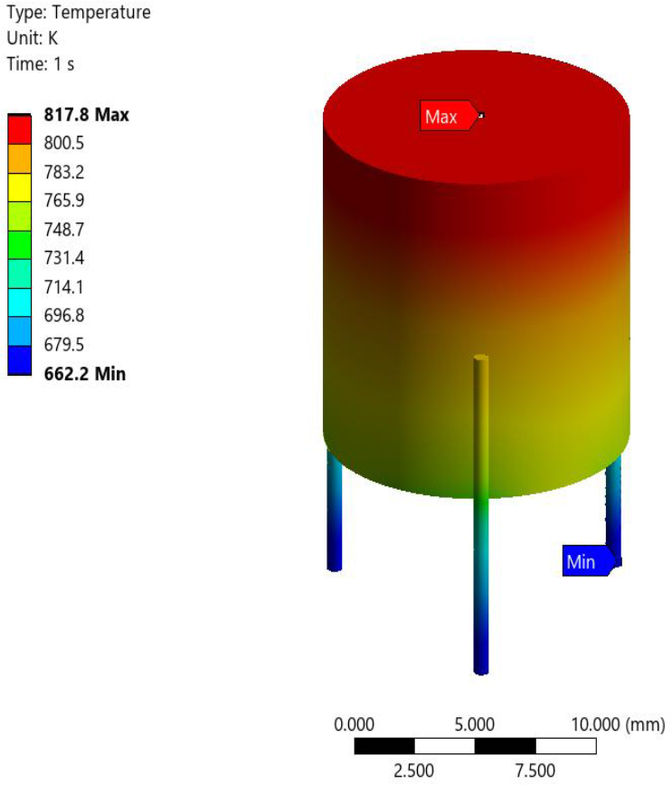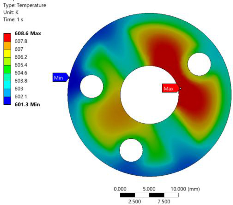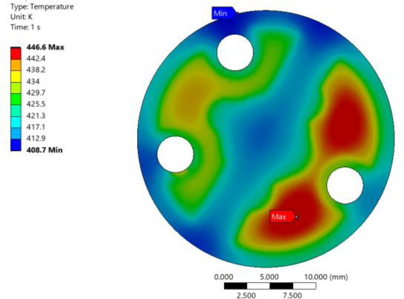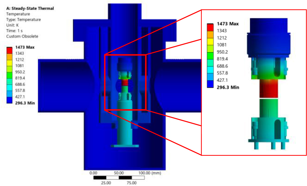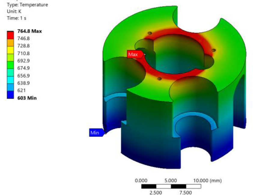 On the anode side, according to Fig. 16, the temperature of the ceramic pad is 608.6 K. The lower temperature of the cathode pad and the manipulator core compared to the anode temperature is due to the liquid cooling of the manipulator core.