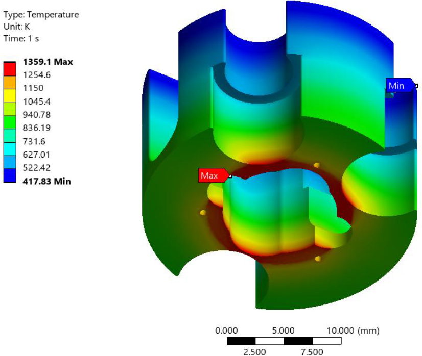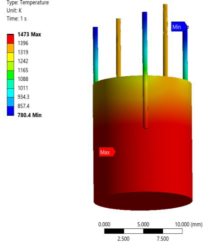 The simulations were carried out for cathode temperatures in the range 873.2 K - 1473.2 K. A relatively low initial temperature was chosen in order to illustrate trends in temperature distributions. The maximum operating temperature of the 311M dispenser cathode is 1473.2 K. This temperature was adopted as the boundary condition in the model tests. The heat source was defined by setting the temperature of the tungsten microheater of the cathode.