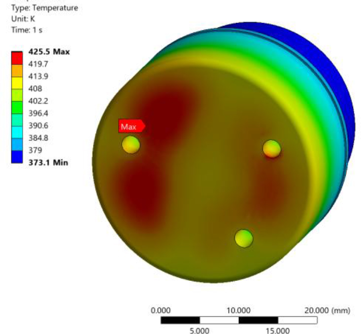 The manipulator core, which remains in contact with the ceramic pad, reaches a temperature of 425.5 K, as illustrated in Fig. 15.