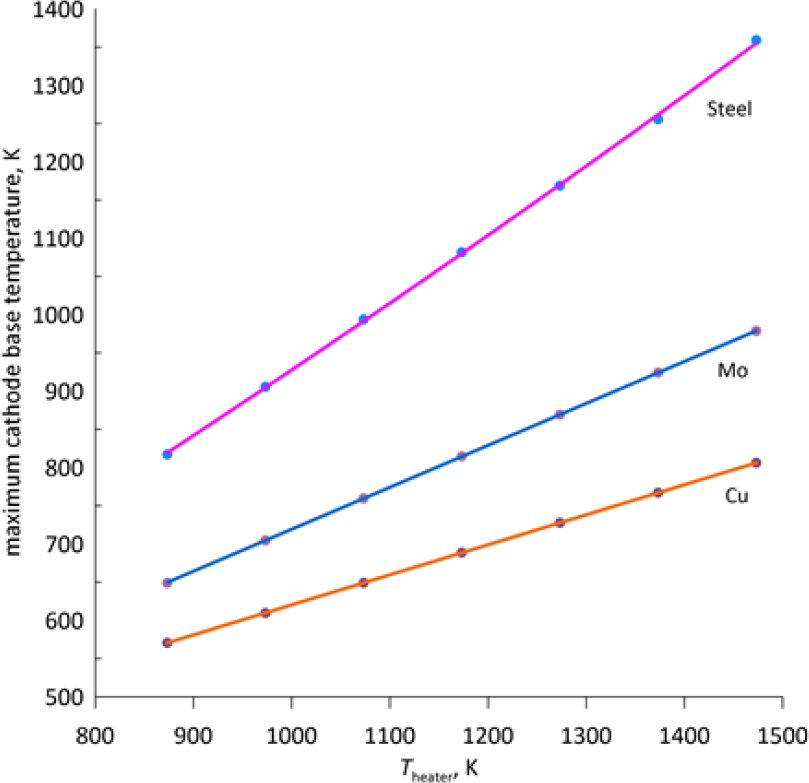 To avoid potential contamination of the cathode emission surface by 316L stainless steel component vapors, particularly toxic nickel vapor, under high temperature conditions (Fig. 12), the temperature limit for the steel cathode base was determined based on the arbitrary criterion of a 5% permissible decrease in electron emission current. Based on the curve for nickel shown in Figure 1, the temperature at which the electron emission current drops by 5% was estimated to be 1133.2 K. In order to determine the maximum cathode temperature under these conditions, the temperatures of the cathode, cathode base, anode, and anode base were determined as a function of the tungsten microheater temperature in the range from 873.2 K to 1473.2 K, which are presented in Tab. 2.