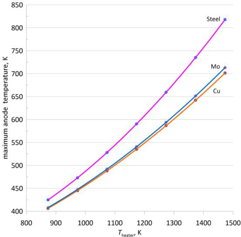 The temperature differences between the anodes are also caused to a significant extent by the heat dissipation from the anode through the anode base to the vacuum chamber supports. The anode mounted on a copper base reaches the lowest temperature, while the anode mounted on a molybdenum base reaches a slightly higher temperature. From the perspective of the theoretical energy efficiency limit (formula (4)), a low anode temperature is advantageous, so it can be assumed that copper is the preferred material for the anode base.