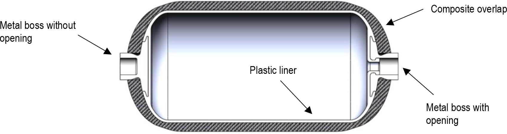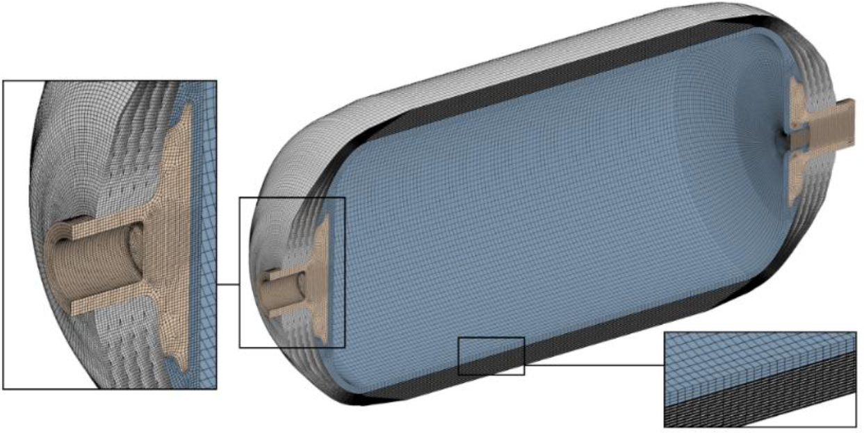 A Type IV composite tank with a cylindrical shape was designed, with an internal plastic liner and aluminium bosses at the ends of the tank [13, 21, 22]. Figure 12 shows a cross section of the model with general dimensions.