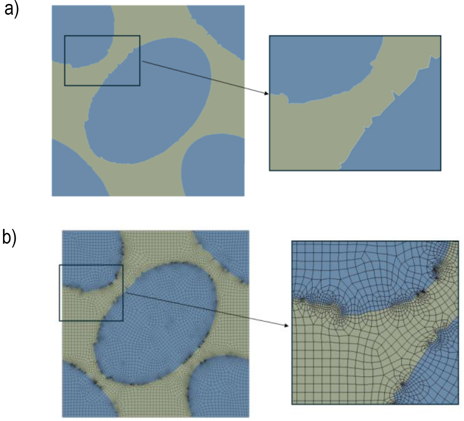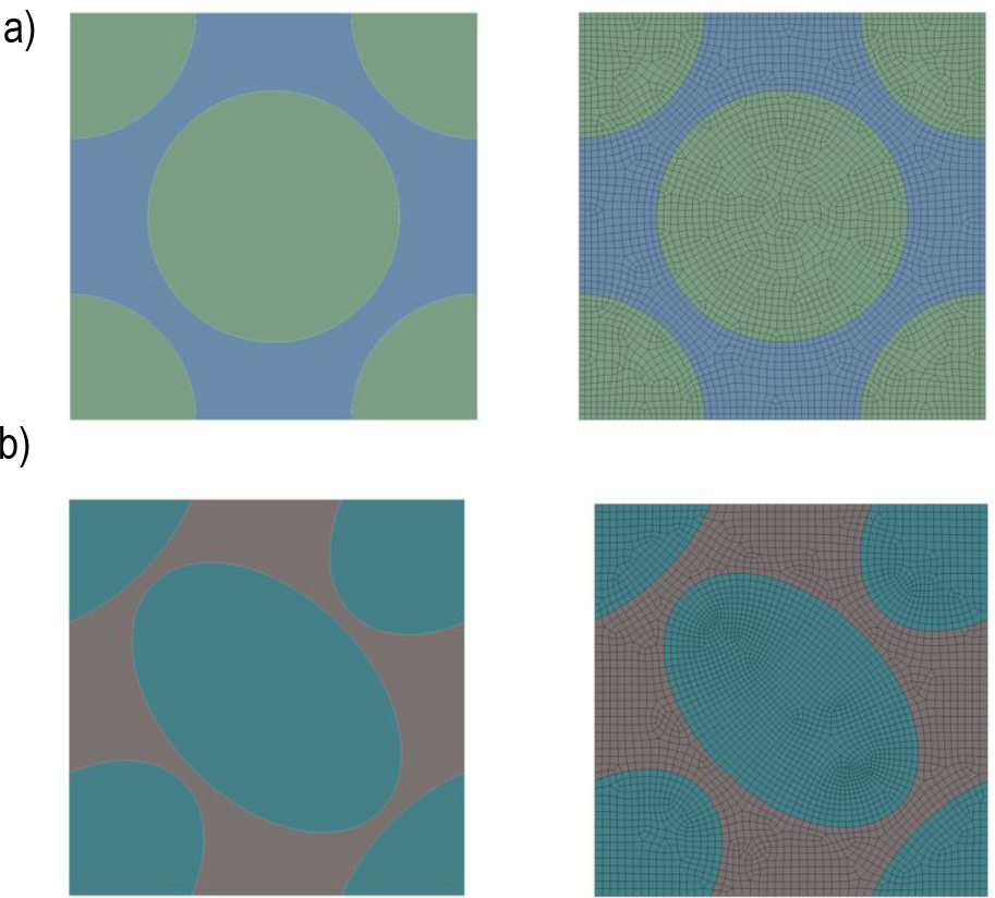 The representative volume element has a cube shape, where the ratio of the materials used is 60% fibre and 40% resin. Three different fibre geometries were used to build a representative volume element. The first uses a circular fibre diameter of 7μm, which is what the fibre manufacturer states. The second geometry is based on a simplified elliptical shape, which is a simplified scan of the actual fibre. The last geometry reproduces the actual scan of the fibre, which is shown in figure 3. Using material designer, only an RVE model with a circular fibre was created, and using Ansys mechanical, models using all three proposed fibre geometries were created. In total, therefore, results from four modelling approaches were obtained and are summarised in Table 6. Figures 4 and 5 show geometric models of RVE with three fibre shapes and a finite element mesh.