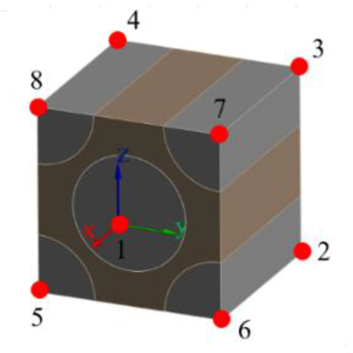 The determination of all nine material constants was achieved by setting six loading conditions, namely tension in the X, Y, Z directions and shear in the XY, XZ and YZ planes. The equations used were divided into three groups, categorised by faces, edges and vertices. Each vertex of the cubic RVE model was assigned a number, as illustrated in Figure 4, and the displacement equations [16, 17, 18, 19] were defined using these numbers of vertices.