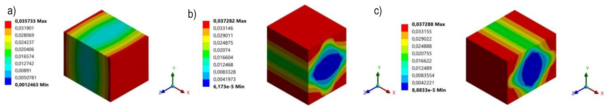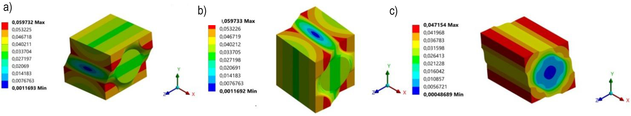 Displacement distributions of RVE: a) tensile in X-direction, b) tensile in Y-direction, c) tensile in Z-direction