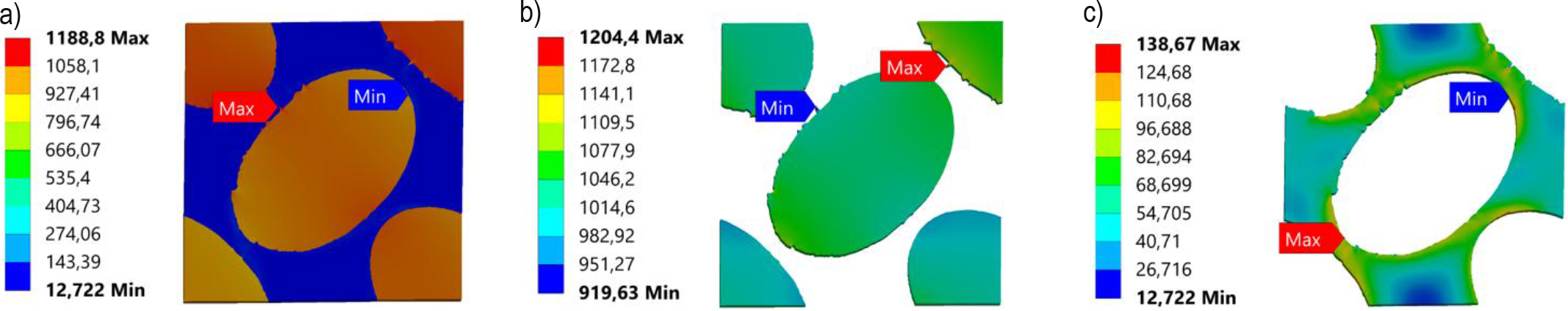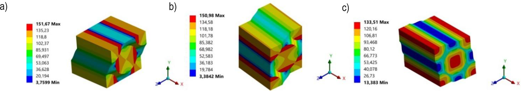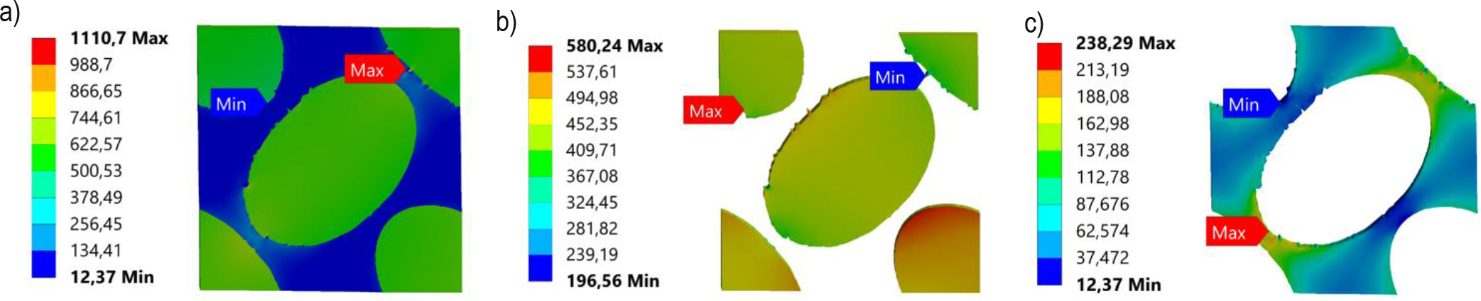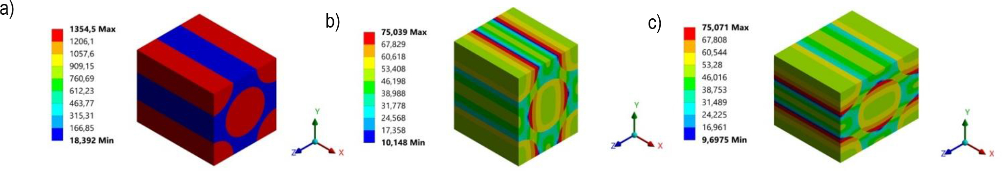 Equivalent stress distributions of RVE: a) tensile X-direction, b) tensile Y-direction, c) tensile Z-direction