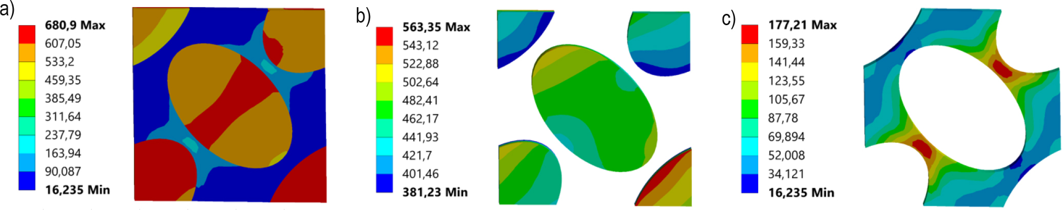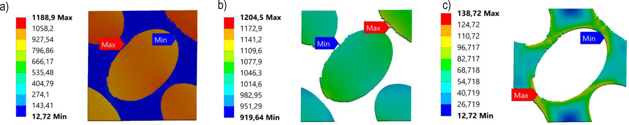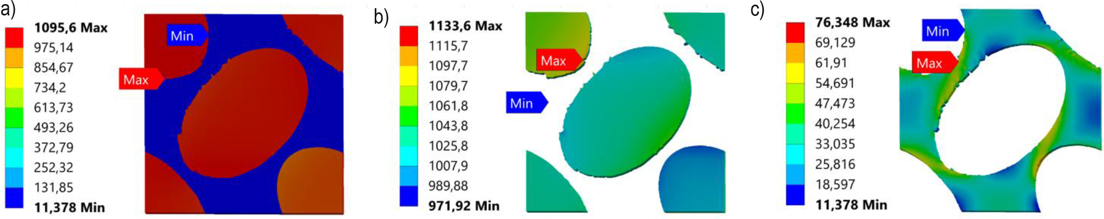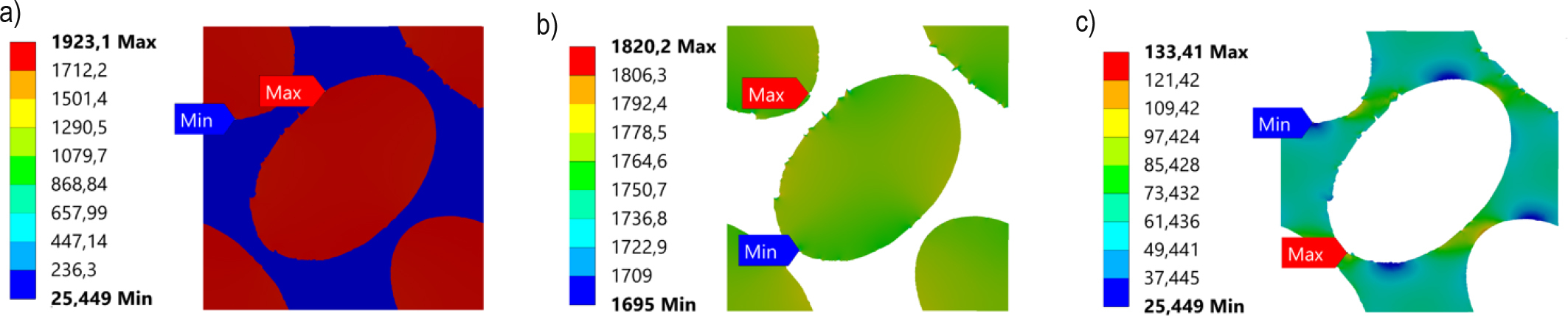 Equivalent stress distributions of RVE: a) tensile X-direction, b) tensile Y-direction, c) tensile Z-direction