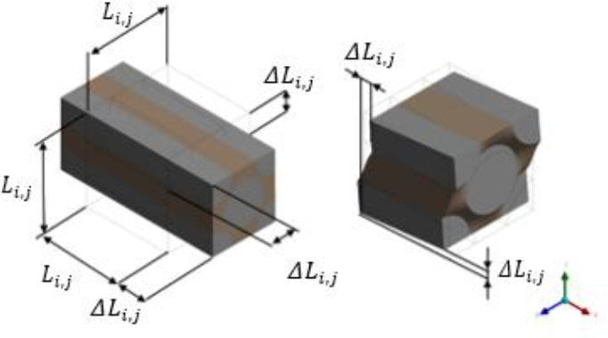 Where E is Young modulus, v is Poisson ratio, G is Kirchoff modulus and i,j are directions of the local coordinate system (x, y, z). Fi is the force normal to the surface in i direction, Fi,j is the shear force in i direction applied to a surface normal to j direction. Li,j is dimension of RVE with respect to the local coordinate system, △Li,j is the displacement under loading conditions. Top and bottom surfaces are normal to Y axis, front and back surfaces are normal to X axis, right and left surfaces are normal to Z axis. From tension in X direction Young’s modulus E1 and Poisson’s ratio v12, v13 are calculated. Similarly, Young’s modulus E2 and v23 Poisson’s ratio are calculated from tension in Y direction and E3 Young’s modulus is obtained from tension in Z direction. Kirchoff modules are calculated from shear loads in XY, YZ and XZ planes. Examples of labelled dimensions and displacements for tension and shear are shown in Figure 11. Table 6 shows the results of the material constants obtained by the two methods and using three different fibre geometry.