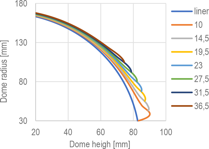 nR is the total number of helical layers and t0 is the thickness of fibre band. In the dome section where the radius of the tank varies from r2B to R, the thickness is calculated using the following equation:Based on the calculations using the equations shown, thickness distributions were obtained and used to build the numerical model. The overall lay-up configuration is shown in the Table 10 and the thickness distribution of the composite at the dome part is shown in Figure 13 for the first 8 helical layers.