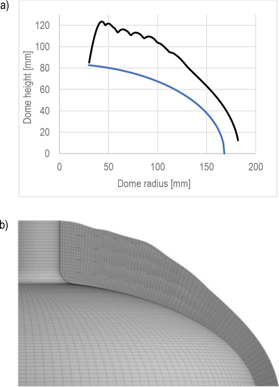 Thickness distribution of composite at dome part in 3D model: a) Wang method, b) numerical model