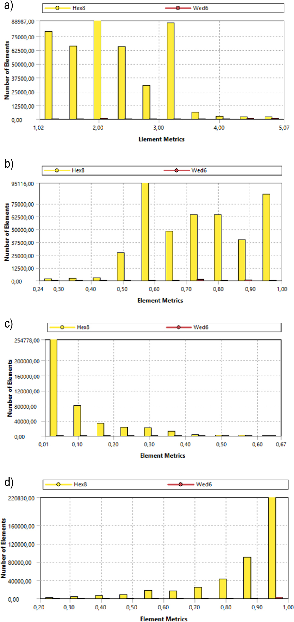 Quality of finite elements mesh graph: a) aspect ratio, b) element quality, c) skewness d) Jacobian ratio