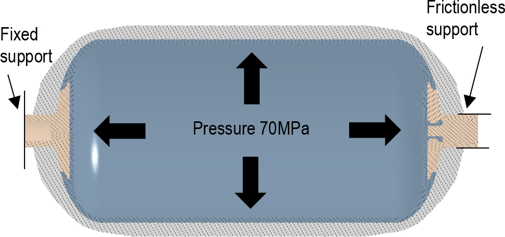A fixed support is used in the end face of a closed aluminium boss. The internal pressure in the cylinder is 70MPa. Surfaces of an aluminium boss that are in contact with plastic liner surfaces are shared using the Share Topology function. Frictional contact was defined between the composite inner and outer surfaces of the plastic liner and the aluminium boss with a coefficient of friction μ = 0,2 [4, 5, 26]. On the outer cylindrical surface of the open boss, frictional contact is used to provide more stability for this model during simulation. Due to the use of non-linear frictional contact and high pressure, large deformations were included in the simulation options.