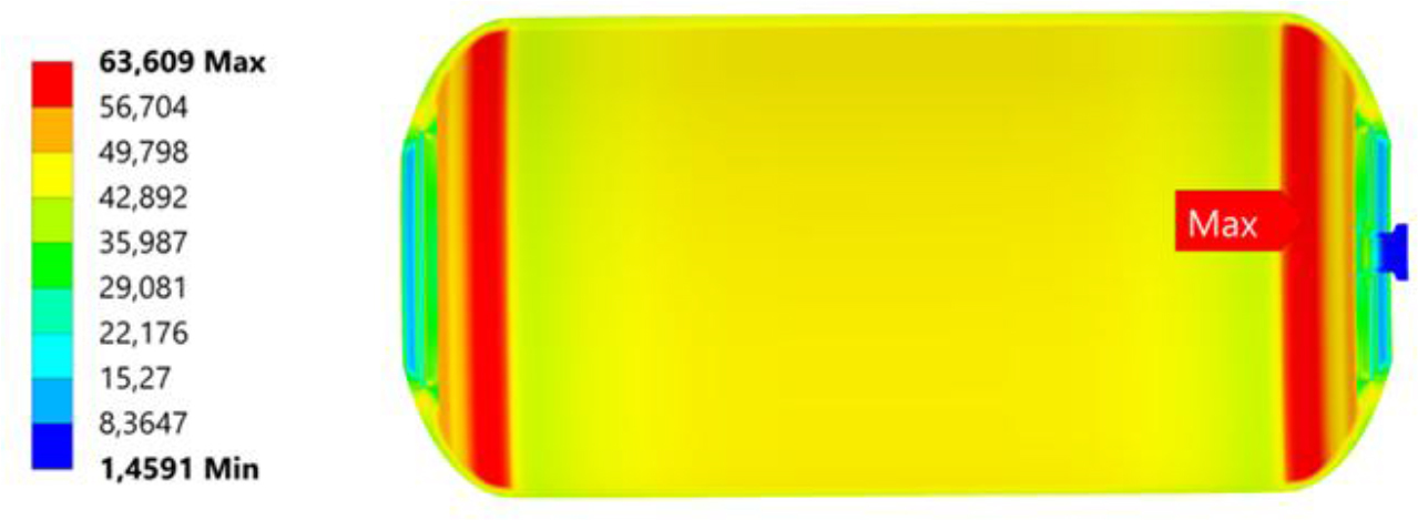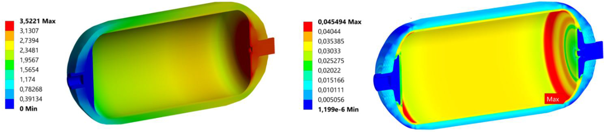 After the numerical simulation, the following results are presented: the distribution of displacements and deformations of the structure, the stresses in the liner and the bosses, and the distributions of the failure indices of the composite structure using the previously mentioned criteria. In addition, the maximum values of these failure indices for each layer are presented and a comparison is made between the results obtained using these criteria. All distributions are presented for the model, considering the material constants determined for the round fibre in the Material Designer. This is because the differences in results on a macroscopic scale, when using the other composite constants, are negligible.