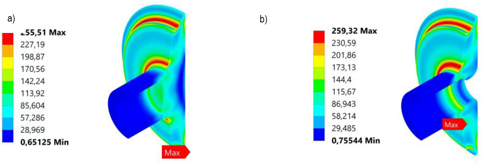 In the closed aluminium boss, the highest value of von-Mises stress is 255,51MPa and is located at the rounding where the composite laminate ends at a radius of 30mm, which is understandable since there is a sharp change in the stiffness of the model. In the open aluminium boss, the stress distribution is very similar, with the maximum value for this element being 259,32 MPa at the inner hole where the liner has bonded contact with the boss. In both stubs, the yield strength, which is 276 MPa, was not exceeded. The next figure shows the distribution of HMH reduced stress in the plastic liner. The maximum stress value in the liner is attained at the point at which the liner's shape transitions from elliptical to cylindrical. This value falls below the yield strength of the liner material. From the distribution, the values in the cylindrical section remain constant, reaching approximately 40-50 MPa.