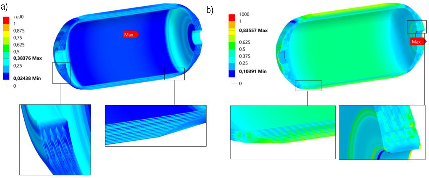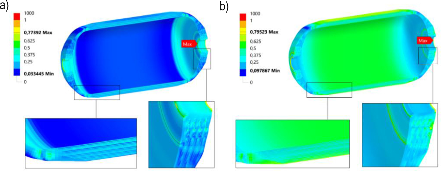 The evaluation of composite laminate was conducted using the puck failure criterion. Figure 21 provides a visual representation of the distribution of fibre and matrix failure. Table 11 presents the maximum values of the puck failure criterion for each layer winding angle. The maximum failure fibre index value of 0,385 is observed in the cylindrical section of the first hoop layer, with values approaching this maximum found in the initial few hoop layers of the cylindrical section. Conversely, the minimum value of 0,02 is attained in the outer layer of the composite layer at an angle of 41° in the dome section. Larger values exceeding 0,3 are attained in the vicinity of the composite's interaction with the aluminium boss and within the composite's inner region, adjacent to the transition from a cylindrical to an elliptical shape. Given a safety factor of 2,5, it can be deduced that the fibre satisfies the stipulated strength criteria, as the permissible value of this factor is 0,4. Additionally, values approaching 0,3 are achieved at the point of contact with the polar hole. The maximum value of the matrix failure index is 0,836, which is located near the polar hole on the external surface of the composite overlap, while a value closer to the maximum is observed at the inner surface of the composite overlap, where contact is made between the aluminium boss and the plastic liner. High values of failure also occur in the section where the shape changes from cylindrical to elliptical. In the cylindrical part, the outer helical layers exhibit higher values of destruction indices ranging from 0,6 to 0,7, while the inner layers demonstrate values of approximately 0,4 to 0,5. For the hoop layers, the maximum value of the matrix failure index is recorded as 0,544, which is observed in the external hoop layer. In contrast, the internal hoop layers exhibit lower values. It is evident that the failure of the matrix is prevented due to the failure index value not exceeding the threshold value of 1. The results presented in Table 11 demonstrate a decrease in the maximum destruction indices of the helical layers for the fibre failure criterion as the winding angle increases. A comparison of the distributions of Puck's fibre and matrix failure indices reveals that for each winding angle, the values of the failure indices of the matrix are higher compared to fibre indices, indicating that the matrix is the primary source of failure in this construction.