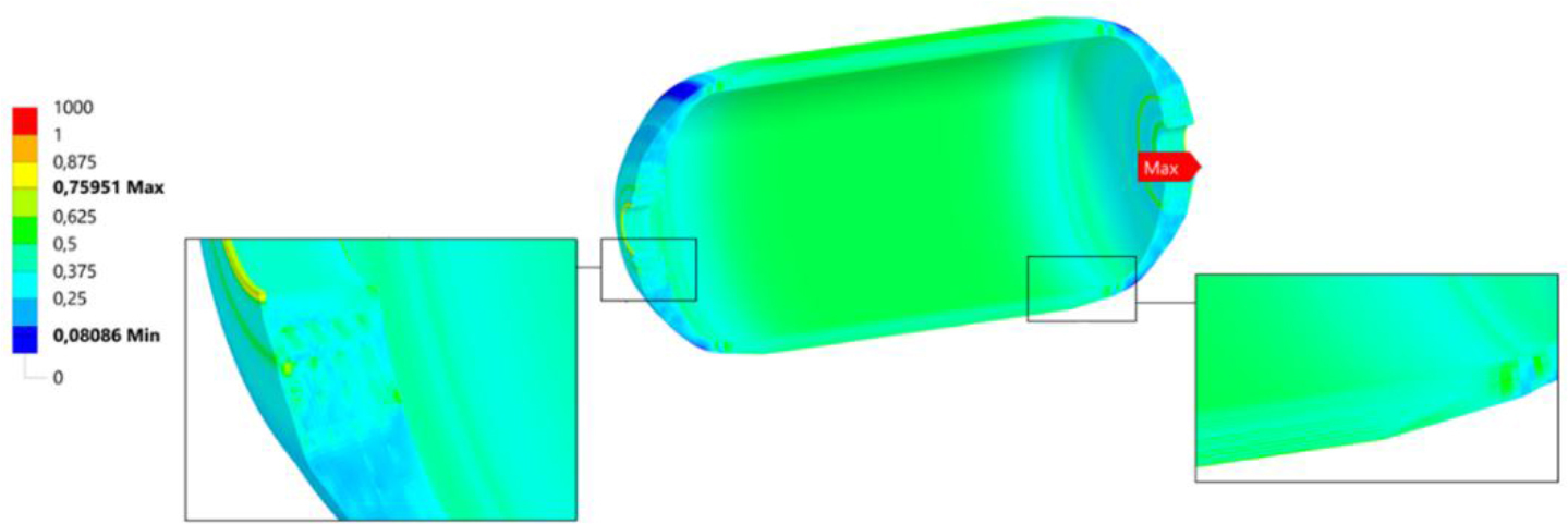 One of the critical points of the structure is where the composite overlaps with the liner and the boss, where there is a sharp change in stiffness, causing an increase in stress in the composite, as can be seen from the failure distributions of the composite for all the criteria used. The values do not exceed the maximum, but this is one of the most stressed areas. For the most part, the maximum values of the failure indices are reached in the outer cylindrical part in the helical layers, where composite cracking would occur at higher pressures. There are also high values in the part of the dome close to the hole (such as in the outer helical layer), but these are small areas around which the values are much smaller. It is possible that increasing the accuracy of the layer distribution in the numerical model, or arranging them differently, would compensate for this phenomenon.