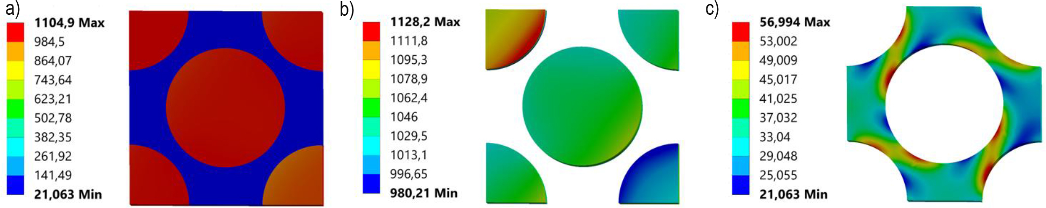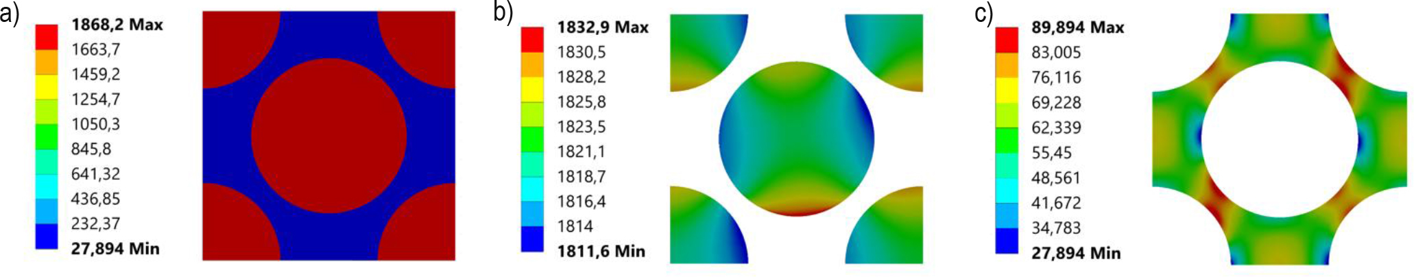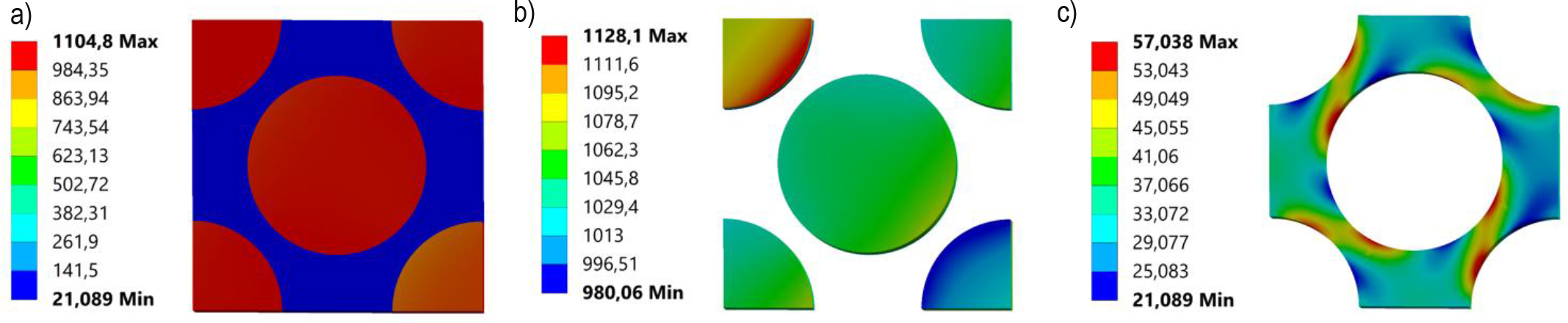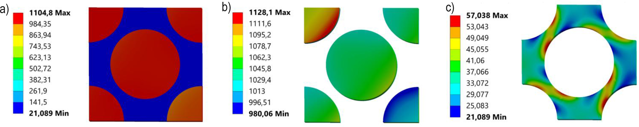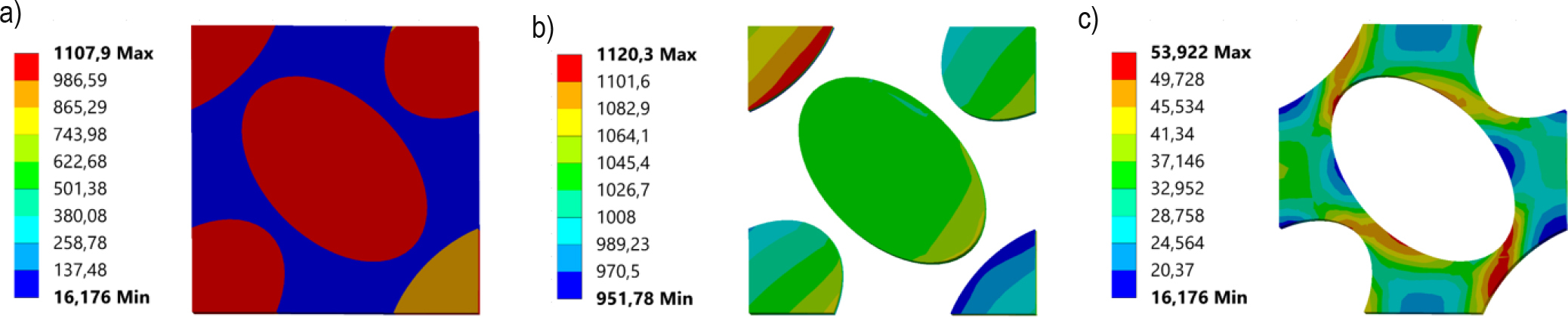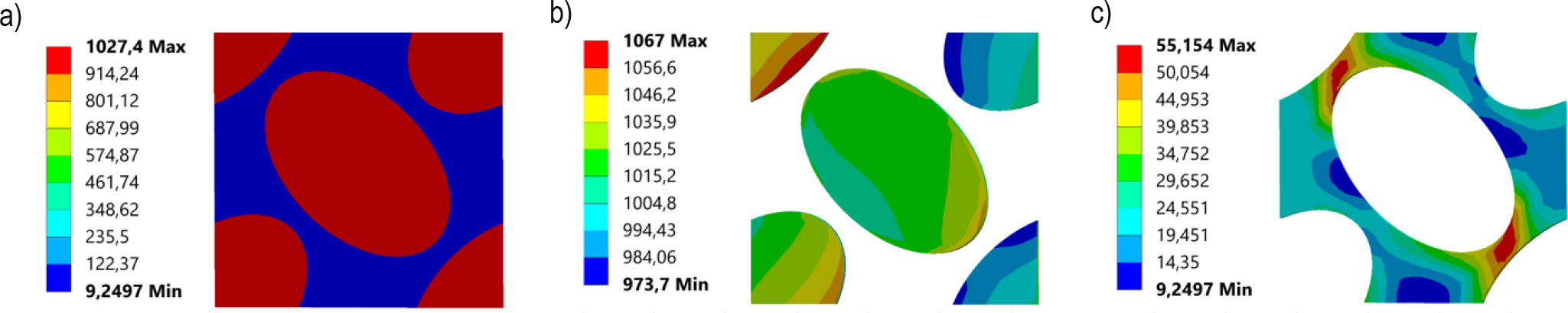 Stress distributions for maximum Hashin fibre failure criteria strains: a) Equivalent Huber von-Mises stress for RVE, b) normal X-direction stress for fibre, c) Equivalent Huber von-Mises stress for matrix