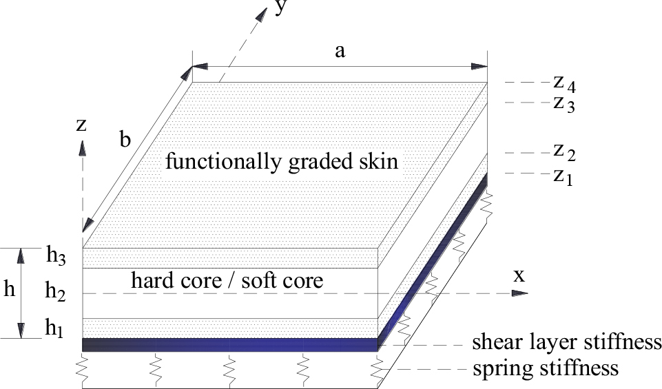 Considering rectangular FGS plates with HC or SC resting on an elastic foundation as shown in Fig. 1. A group of h1 – h2 – h3 represents the ratio of thicknesses.