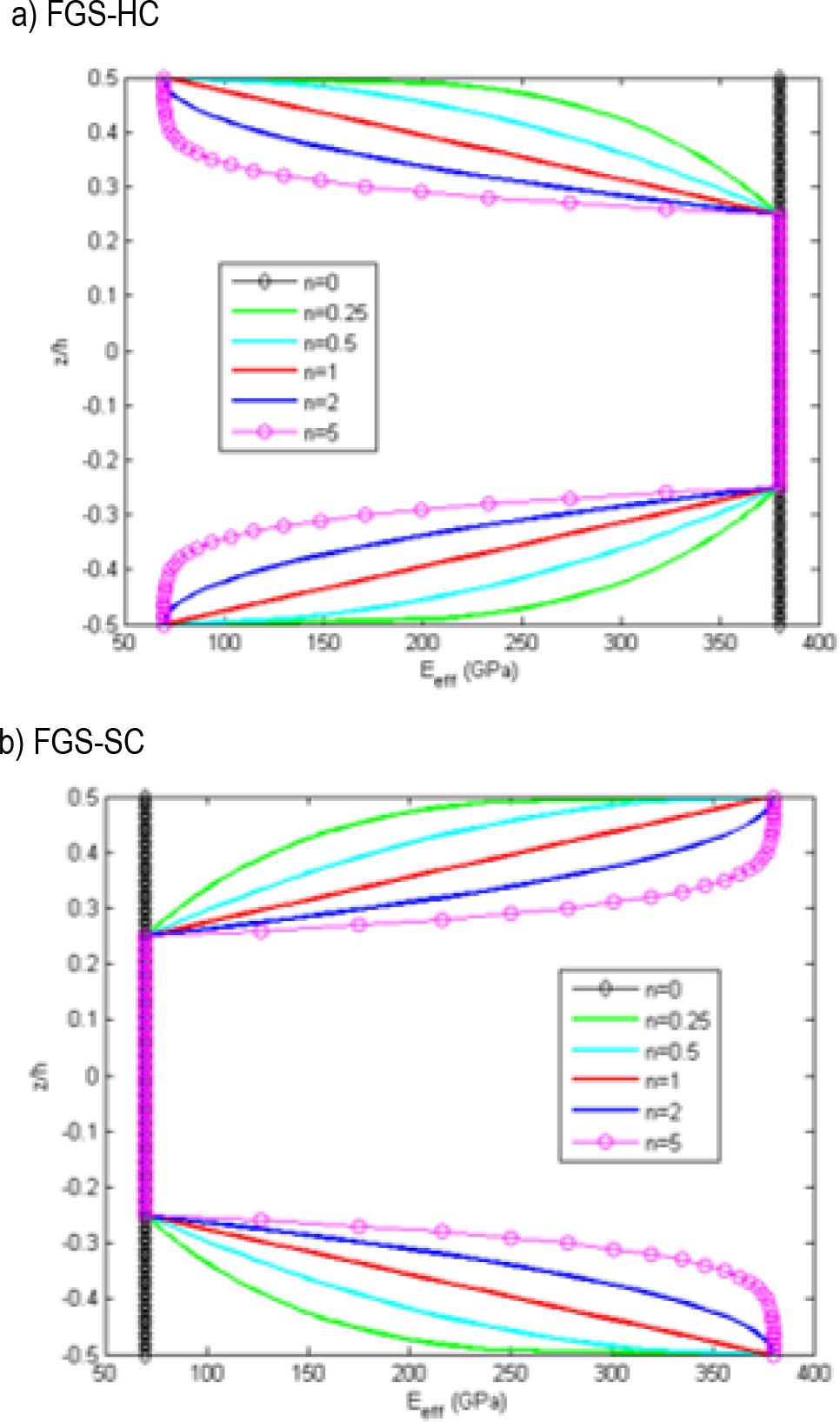 + For FGS plate with SC (FGS-SC):The effective material properties of FGS plates are determined by
