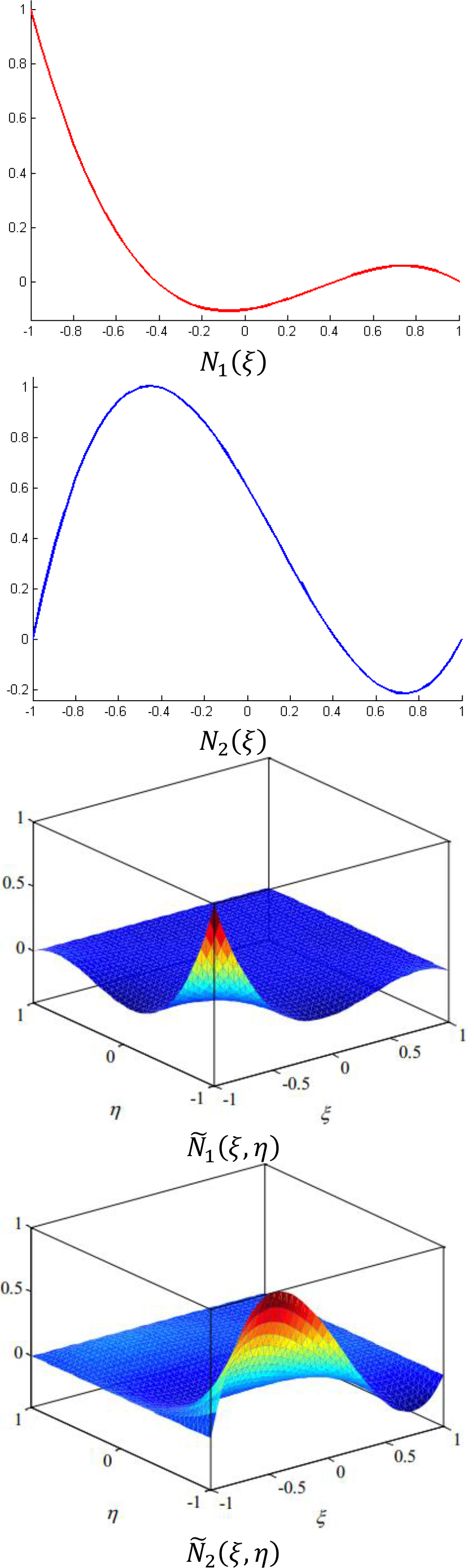 with Ni(ξ) or Nj(η) is 1D p-order shape functions related to the set ξ ∈ [–1,1] or the set η ∈ [–1,1] respectively. Fig. 3 gives some third-order shapes functions related to the Chebyshev polynomials in 1D space and 2D space.The finite element formulation related to Chebyshev polynomials is established as in [25, 26]. The plate is divided by the quadrilateral elements with five degrees of freedom in each node of an element. These components can be approximated through the displacement components at node K