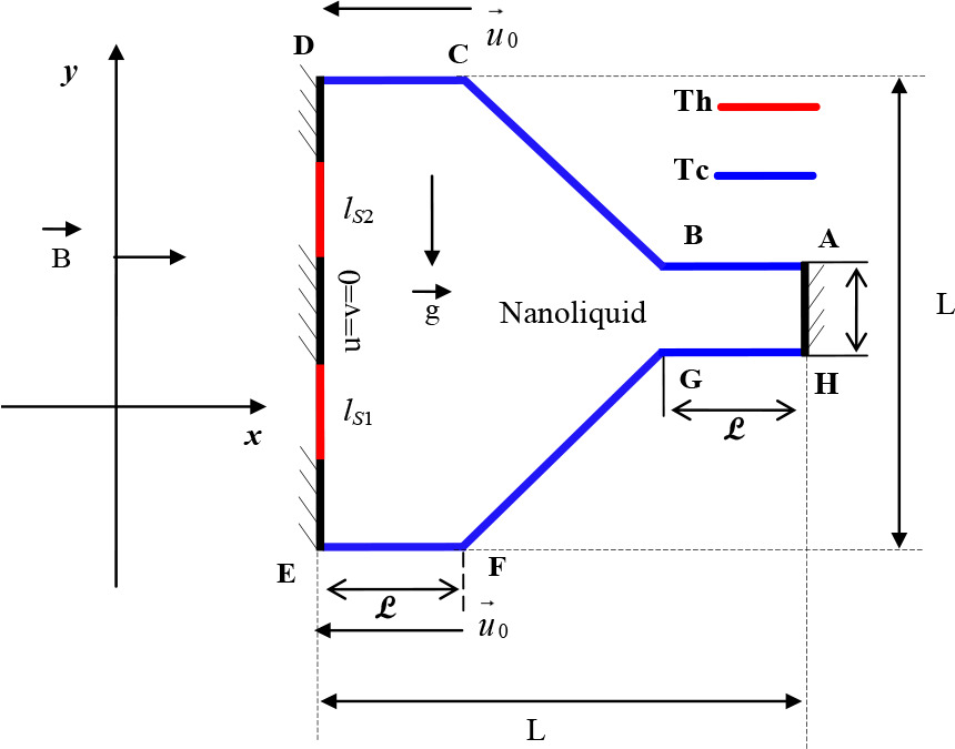 We consider the magnetic nanoliquid mixed convection in a heated thermal convergent cavity. The configuration of the physical model is shown in Fig. 1. Two heat sources are situated at the left wall at constant temperature. The aspect ratio of the enclosure is defined as AR = L/L=0.3. As visible from the graphical view, the superior and bottom walls of the cavity are cold and moving with a constant velocity