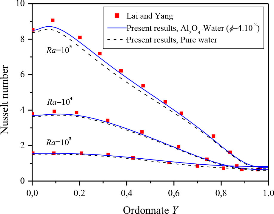 For data validation, the present results are compared with the numerical results from Lai and Yang [34] for the case of nanoliquid natural convection in a square enclosure (Fig. 4).