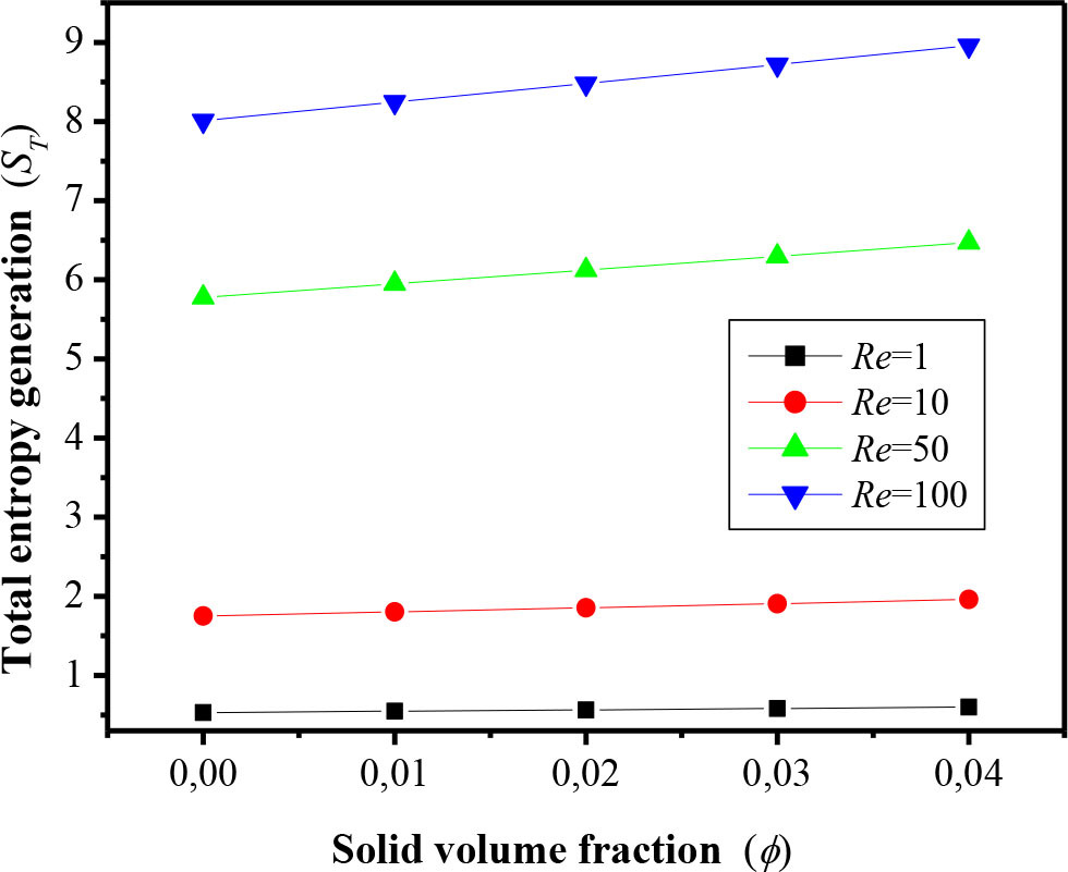 – For all considered values of Re and Ha, increasing the nanoparticle volume fraction leads to an increase in the average Nusselt number and total entropy generation.