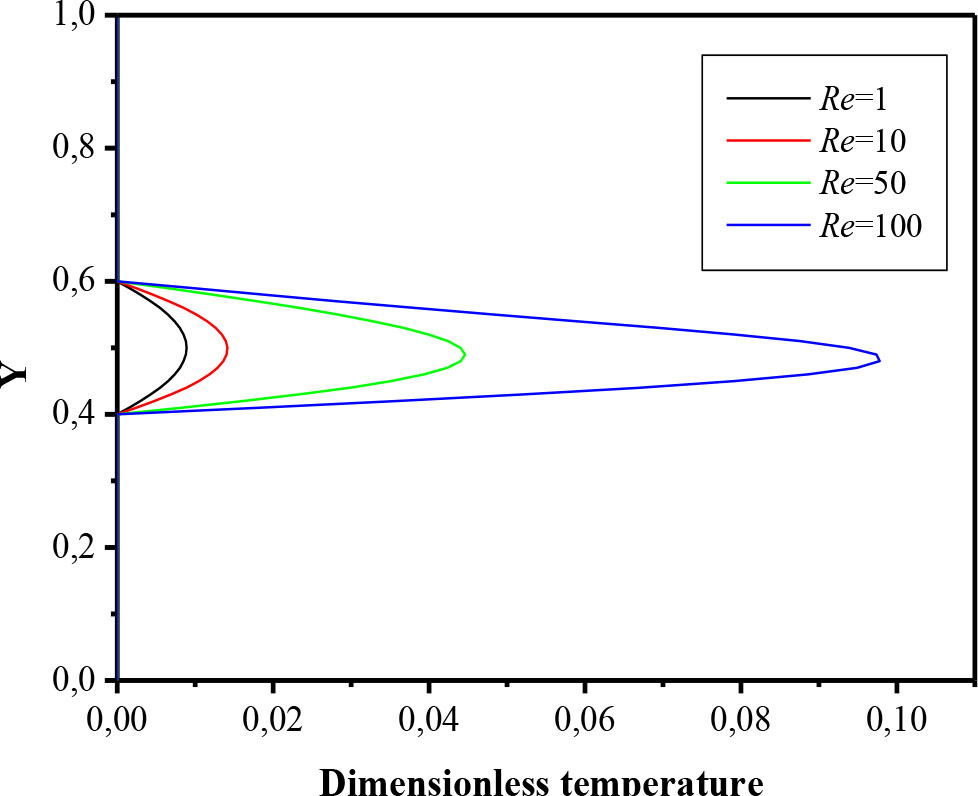 Figs 10 and 11 illustrate the temperature profile within the cavity at two specific positions: x/L = 0.5 and y/L = 0.75, for different Reynolds numbers (Re). These graphs provide a detailed analysis of how temperature evolves within the cavity as Re changes. It is clearly observed that the temperature in the ABGH region of the cavity increases with higher Re. This trend can be attributed to the increasing influence of mixed convection heat transfer, which becomes more dominant as Re rises. At low Reynolds numbers, heat transfer is mainly governed by thermal conduction, a slower and less efficient mechanism for heat transfer. However, as Re increases, mixed convection enhances heat transfer, leading to a more significant temperature rise in regions close to the heated walls of the cavity, particularly in the ABGH area. This behavior underscores the importance of fluid velocity and the convection regime in optimizing heat transfer within confined systems such as the one studied. These findings highlight the critical role of Reynolds number in controlling heat transfer dynamics and suggest that optimizing fluid flow conditions can significantly improve the efficiency and reliability of thermal management systems in practical applications.