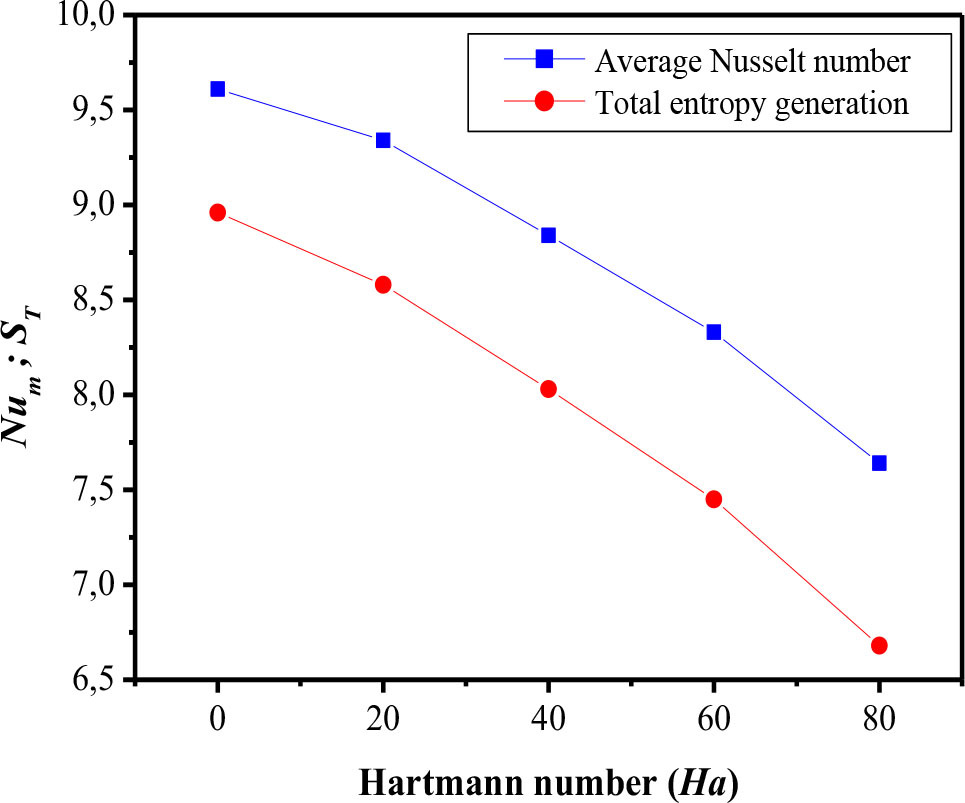 Effect of Hartmann number on average Nusselt number and on total entropy generation for different Hartmann numbers at Ri = 20, Re= 100 and ϕ= 4.10-2