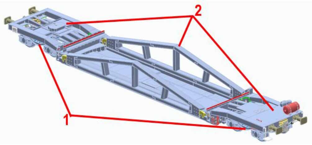 Prototype structure of the intermodal wagon with the rotating loading platform: 1 – standard Y25 bogies, 2 – wagon frame with the body – rotating platform in the lowered part