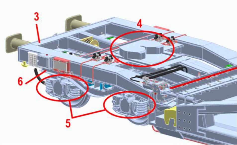 Oblique view of the overbogie part of the intermodal wagon: 3 – wagon frame, 4 – typical fifth wheel for securing semi-trailers, 5 – axle suspension stage of the bogie, 6 – bogie frame