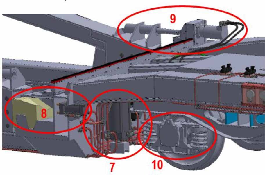 Side view of the overbogie part of the intermodal wagon with equipment: 7 – support mechanism, 8 – side connector, 9 – gear rotating mechanism of the loading platform with drive elements, 10 – classic Y25 bogie suspension stage