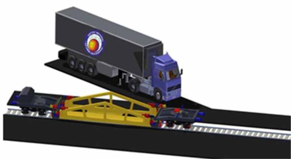 Stage II of loading – rotation of the platform, entry of the tractor with the semi-trailer, detachment and exit of the tractor itself and then re-rotation of the wagon’s loading platform to the transport position