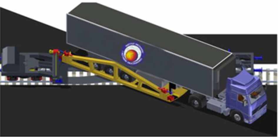 Stage II (Fig. 5) – the truck drives onto the wagon, the supports in the semi-trailer are lowered, the semi-trailer is detached from the tractor and connected with the wagon frame by a fifth wheel coupling, the tractor drives off the wagon and then off the railway platform ramp.