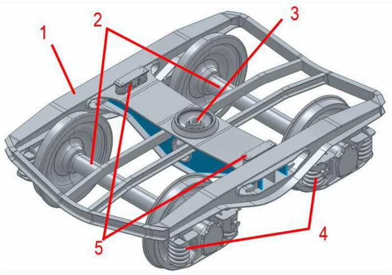 Y25 railway bogie [own development], 1 – frame, 2 – bogie axle, 3 – pivot pin, 4 – suspension (springs, friction dampers), 5 – side slides (mechanical vibration damper)