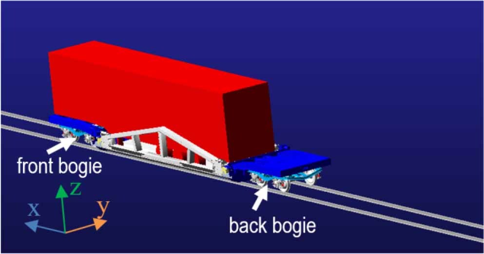 Numerical tests were carried out in professional MBS software [29]. When performing dynamic analyses with numerical methods, it is necessary to adopt certain simplifications and optimize the models in relation to the adopted assumptions. Analyzing models with all the structural details will allow to obtain accurate and reliable results, but this will come at the expense of the time it takes to build such models and increase the simulation and processing time of the results. The bogie model after such simplifications, shown in Fig. 8, does not have a braking system, wagon buffers, bogie elements necessary to install braking systems and increase the rigidity of the frame. The parts were omitted due to their low weight and the way they work, which does not affect the operation of the wagon model during simulations. Springs and friction dampers were replaced with elastic-damping elements [29], using additional translational constraints enabling vertical movement. In addition, as part of the simplification of the model, no side slides were used, which would force the definition of additional contact joints of bodies, and this would extend the simulation time and could cause problems with the convergence of the analysis. The bogie and the frame were connected by means of a typical internal constraint in the form of a spherical articulated connection [29], without the possibility of rotation relative to the X axis with respect to the global coordinate system – Fig. 9. This solution blocks the possibility of rotation of the wagon frame in relation to the bogies, as in the case of side slides. Wheel sets were defined as a set of bodies connected into one monolithic component. The bogie frame was similarly reproduced in the model. The chassis of the semi-trailer and its wheel sets were also modeled as uniform bodies. The movement of the load was limited to the possible rotation in the ZY plane in relation to the feet supporting the semi-trailer at the bottom of the loading platform – Fig. 9. To perform the analyses, it was required to enter output data such as: load, speed and friction. The UIC60 outline wheels were modeled in accordance with the standard [32] and the UIC60 rail heads were modeled as in Fig. 8.