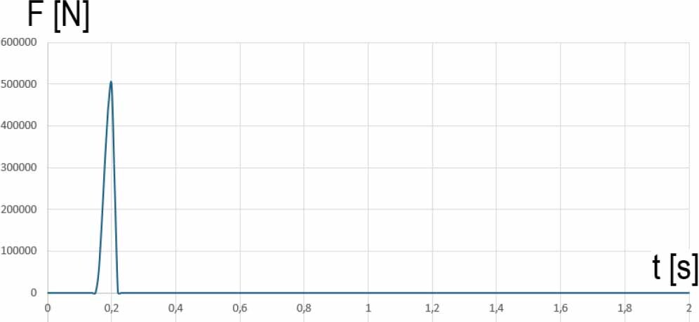 Simulations in stage I of the tests began with checking the free vibrations of the wagon. The vibrating movement of the wagon was initiated by means of a load impulse shown in Fig. 10. To induce the vibration motion of the stationary wagon, a force impulse of F = 500 kN was used, acting vertically and applied to the central pin of the loading platform of the stationary wagon. The value of the exciting force increases linearly from zero in the time interval from 0.15 s to 0.2 s, reaching the maximum value, and decreases linearly in the time interval from 0.2 s to 0.22 s to the value equal to zero. The entire simulation of the wagon vibrations takes 2 seconds. In the initial phase of the simulation, the wagon and the bogies were lowered from a low height above the rail heads in order to correctly position all elements of the structure and initiate the operation of the defined contact areas. The analysis of free vibrations of the structure after excitation was carried out for two variants of damping of the suspension of freight bogies: the lowest output value of [170 N*s/mm] and the highest damping value of 17000 [N*s/mm]. As part of this testing phase, simulations were also carried out for two different wagon configurations: with the semi-trailer and load and without the semi-trailer with load. In the latter variant, the natural vibrations of the wagon were tested without the impact of external loads. In the tests of wagon vibrations influenced by the load in the semi-trailer, the impact of the suspension and semi-trailer wheel tires was not taken into account in the numerical models.
