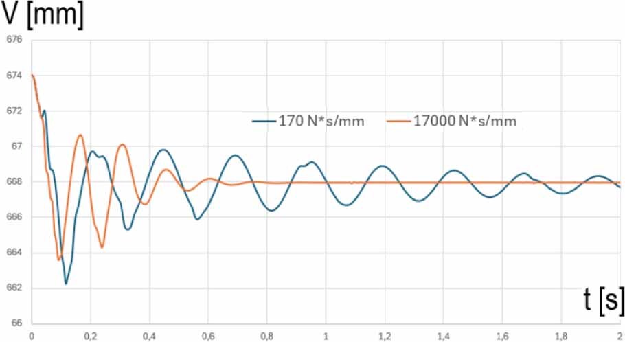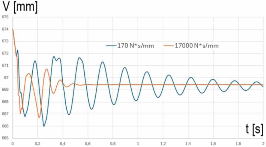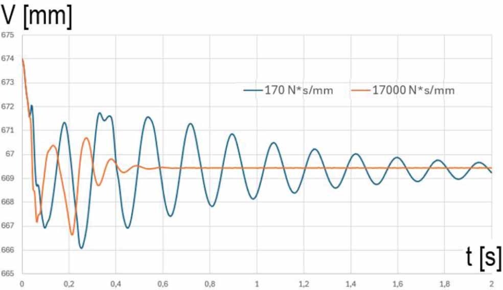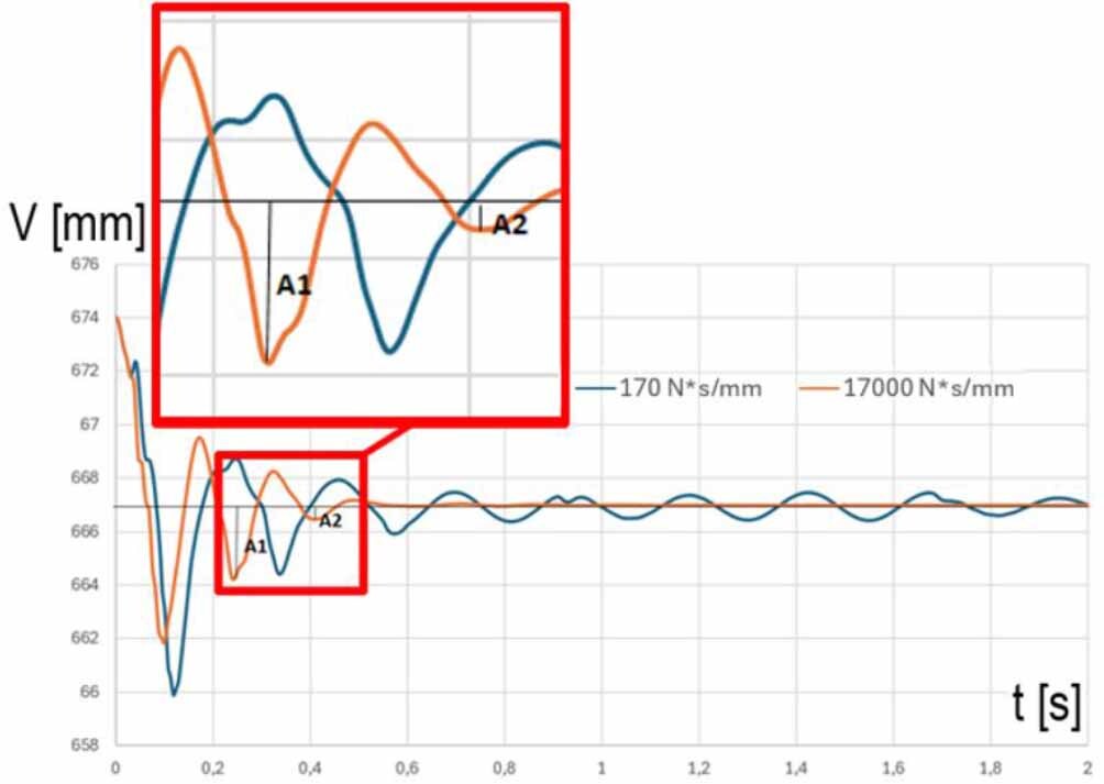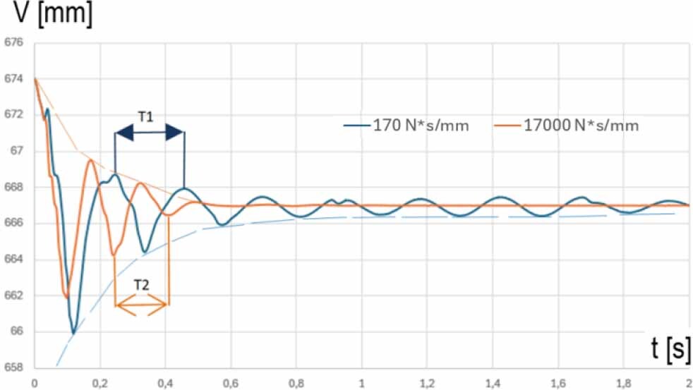 The influence of damping changes on the vibrations of the front bogie caused by the force impulse on the wagon with the semi-trailer. Graphs of vertical displacement as a function of time for two different damping values with marked vibration periods for suspension with different damping variants Cmin = 170 [N·s/mm] and Cmax = 17000 [N·s/mm]